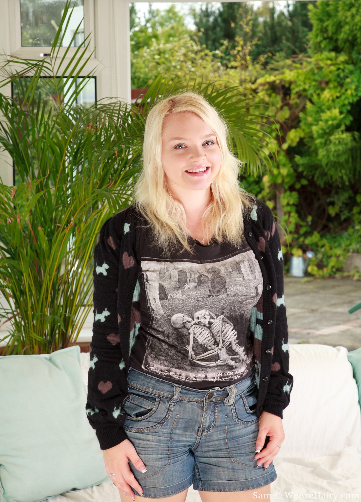 Sam Pictures - The hot sun on Sam's nice pale body excites her. Her heart starts beating and all she can think about is having fun with her wet hairy labia.